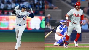 Both teams are packed with power and potential. Key players for the Phillies are Kyle Schwarber, who would be a shoo-in for the MVP if it weren’t for the Dodgers’ Shohei Ohtani. Schwarber ended the season with 56 home runs, one ahead of Ohtani’s Dodger record of 55 bombs. But his slash line of .240/.385/.563 is not nearly as good as Ohtani’s .282/.392/.622. And of course that’s before Ohtani throws a pitch.